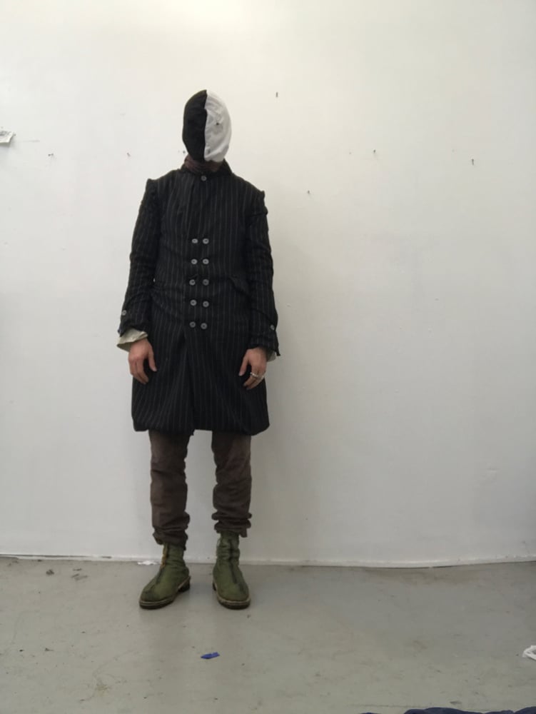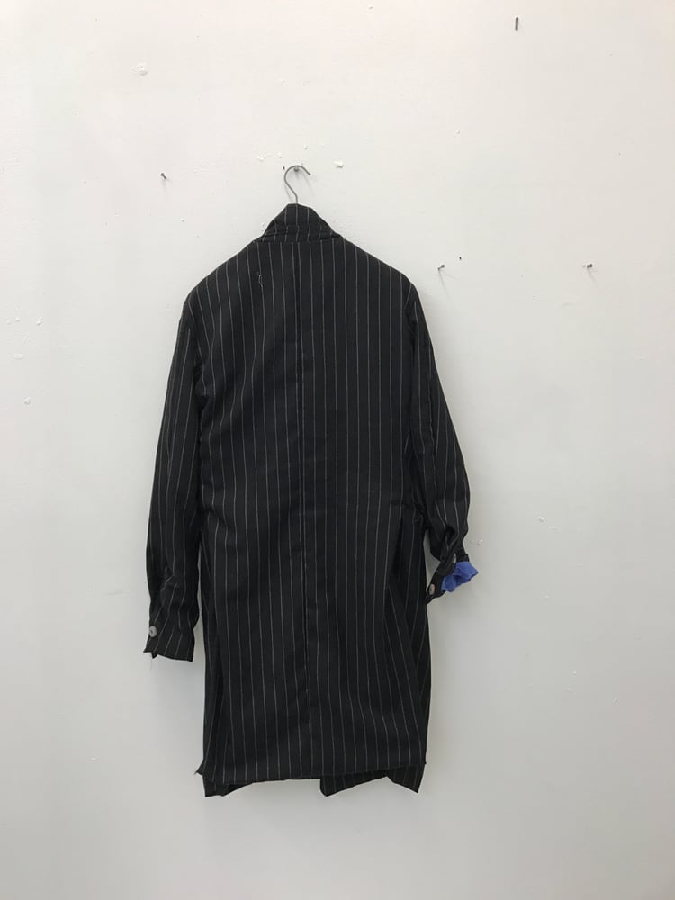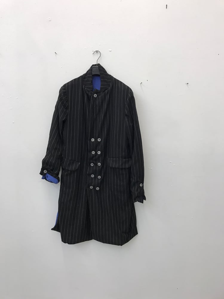 Machine washable pinstriped wool blend double breasted, double vented coat, fully lined, with two interior and exterior pockets and handmade, painted and hand-stitched leather buttons.