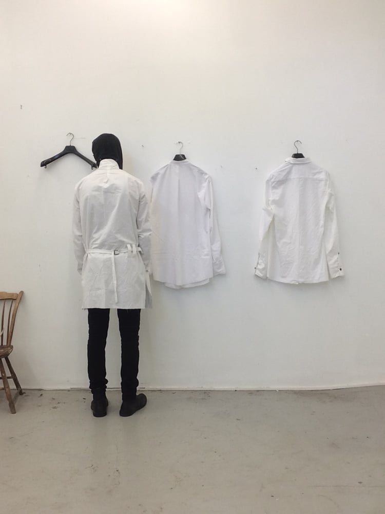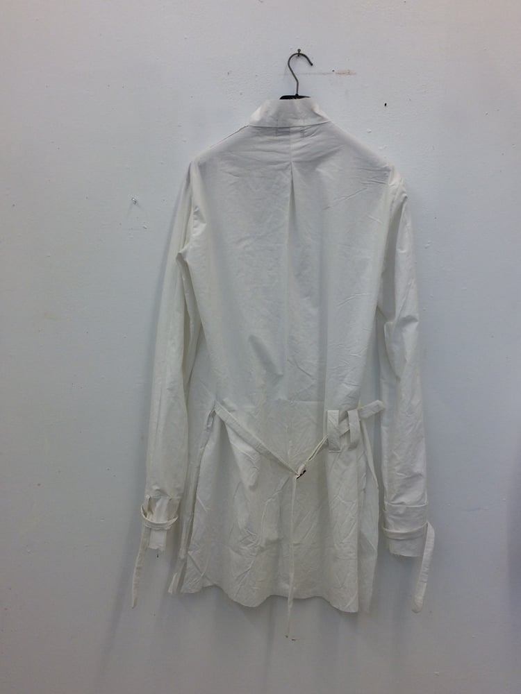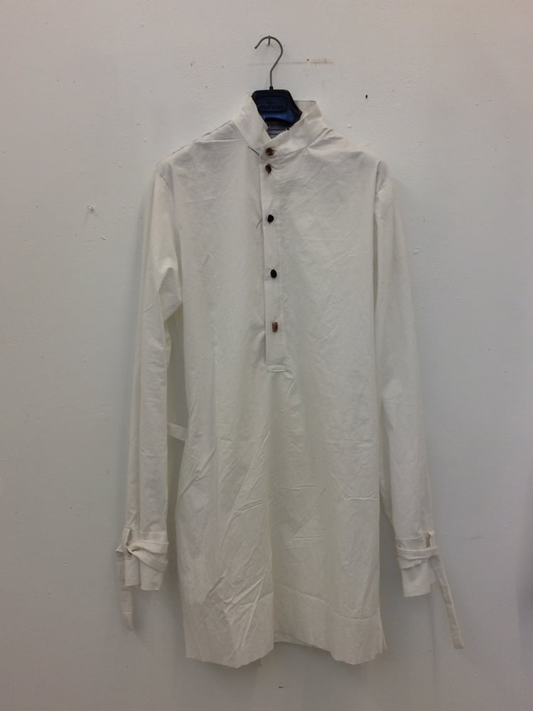 Handmade, overlong cotton henley shirt with raw hems and strapped cuffs and back and painted handmade leather buttons.