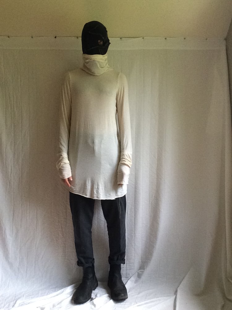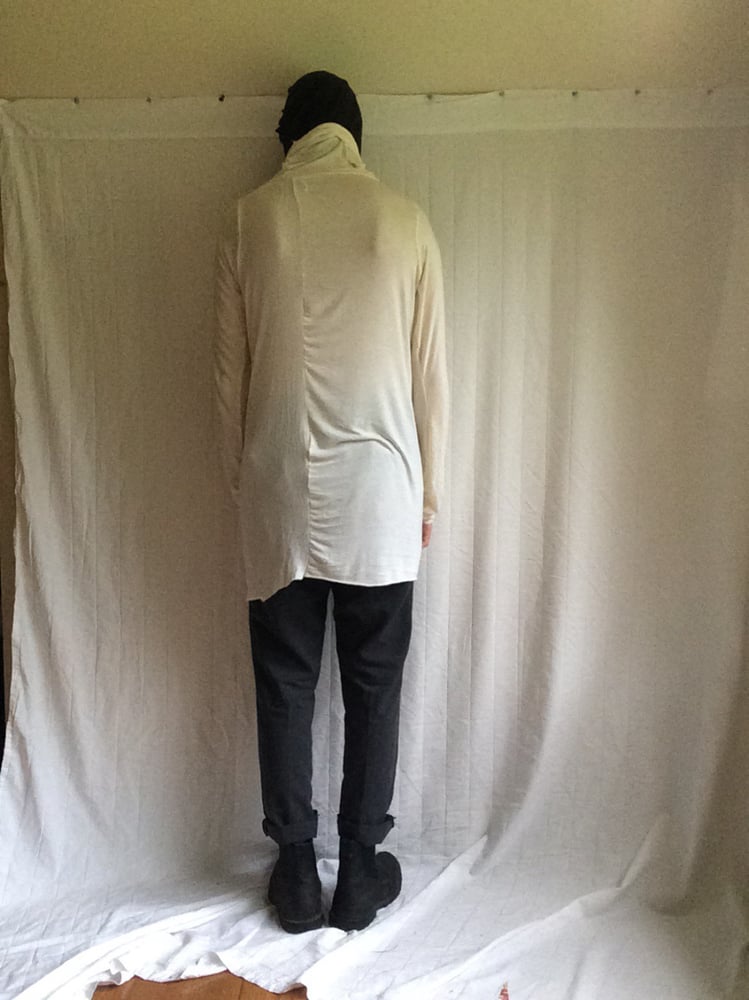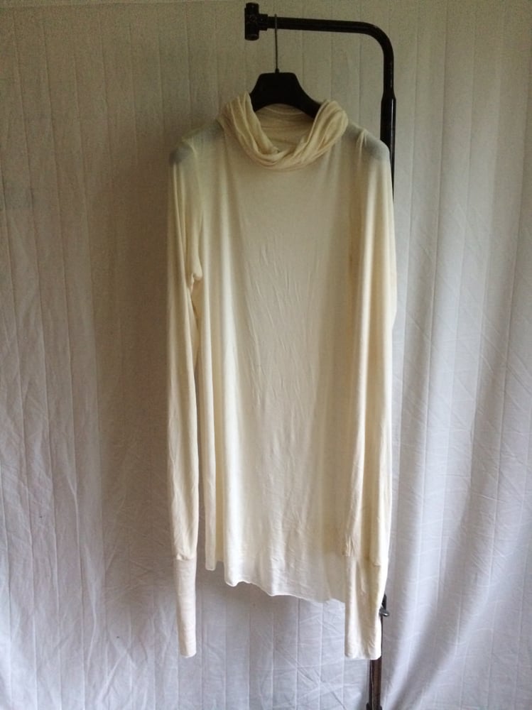 Extra long, single back seam, rayon turtleneck, finished with raw hem details throughout and done in a creamy off-white.